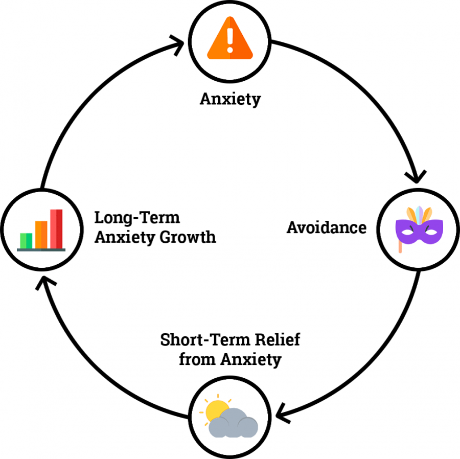 Something that many individuals are not aware of is the cycle of anxiety. Anxiety is a loop that many feel stuck in: individuals experience anxiety, then avoid the situation or stimulus that triggers it. This avoidance brings short-term relief, but only temporarily. Over time, this cycle strengthens the anxiety response and reinforces avoidance, rewiring the brain to flee future anxiety-provoking situations instead of facing them.